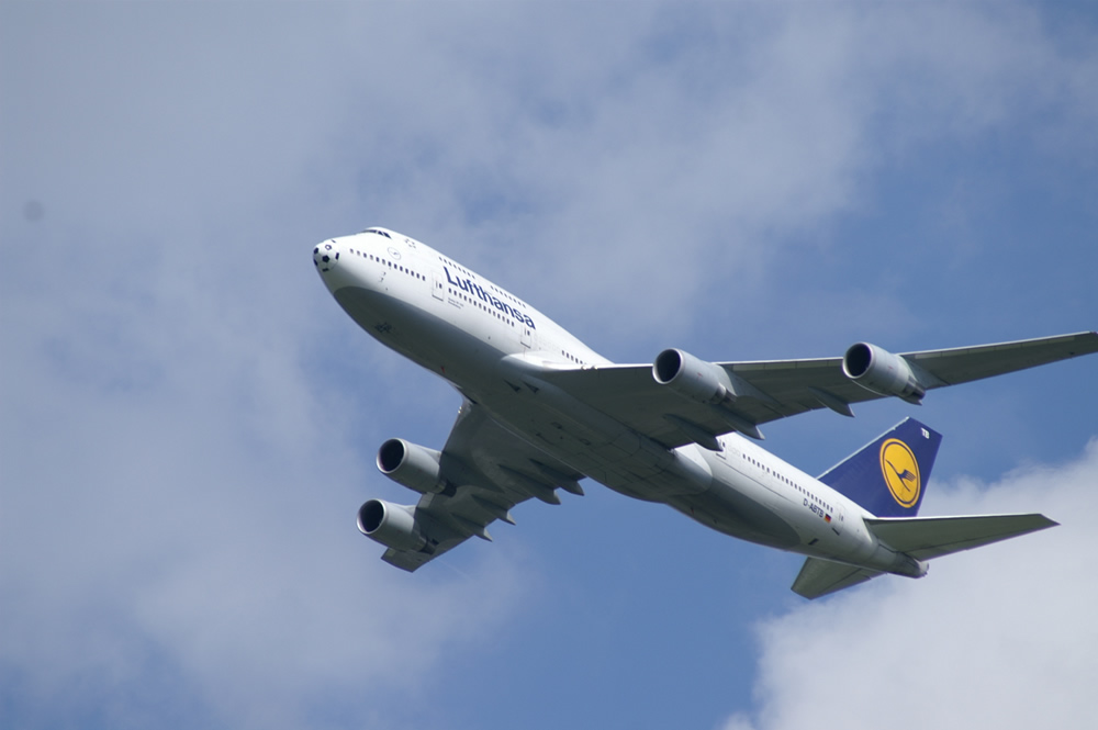 Am Bug des Jumbos prangt noch ein Relikt der vergangenen Fußball-WM.
