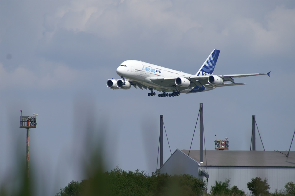 | Nach etlichen Überflügen in etwa 200m Höhe setzt der Airbus mit ausgefahrenen Klappen und Fahrwerk zu einem simulierten Landeanflug an. Dabei scheint er fast das Hallendach zu streifen. | ||