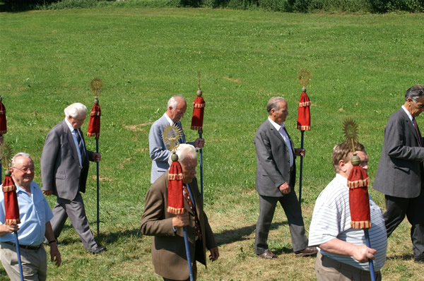 Die älteren Mitglieder der Skapulierbruderschaft mit ihren Bruderschaftsstangen.