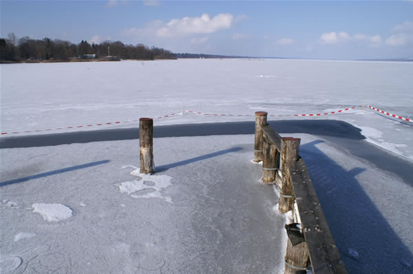 Die Segelvereine begannen ihre Stege mit der Säge freizulegen, um Schäden durch Eisgang zu verhindern.