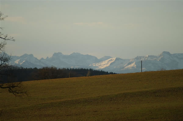 Föhn: Der Blick streift über das Pflaumdorfer Moos zum tiefverschneiten Wettersteingebirge.